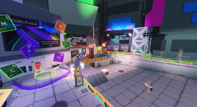 Developed in partnership with Stride K12, Chemistry Craze! is a fast-paced learning game designed for high school science students and delivered through Roblox. Framed as a competitive game show, the experience reinforces core chemistry concepts through three distinct minigames that focus on the periodic table, chemical reactions, and balancing equations. Across these challenges, players solve problems under pressure, earn points, and build chemistry knowledge through repeated practice and play.
